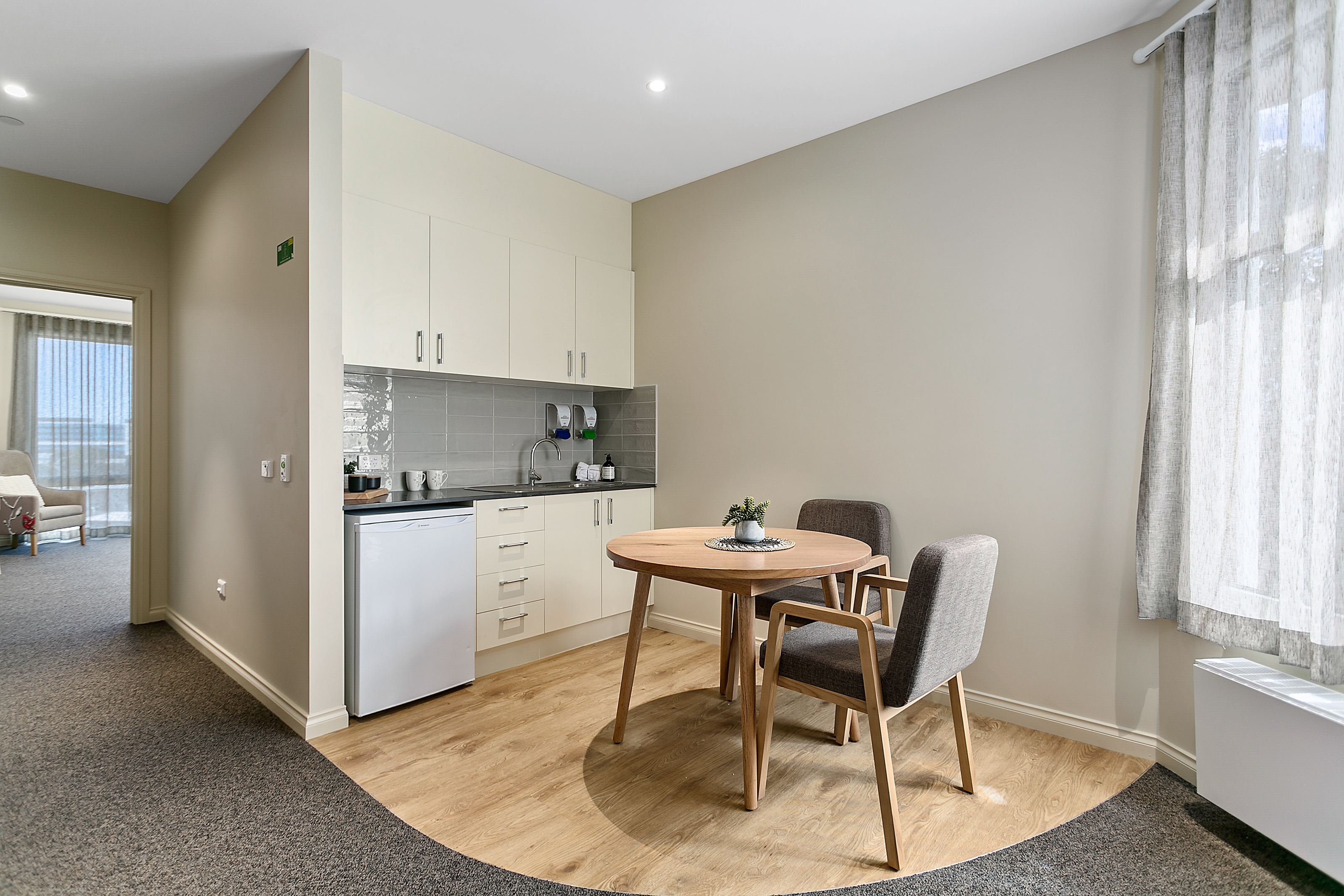 Our home contains 102 bedrooms with a variety of single, shared, companion and couples’ rooms. This allows choice for either your own privacy, for couples to stay together or for residents to make new and close friends through a companion room. Our larger single rooms and couple rooms have separate bed and lounge areas to allow for additional space. For residents living with dementia we have spaces for wayfinding, a spacious courtyard, quiet zones and more secluded spaces. Designated areas and rooms that are of familiarity to the resident acts as a space that is calming and invokes historical memories.