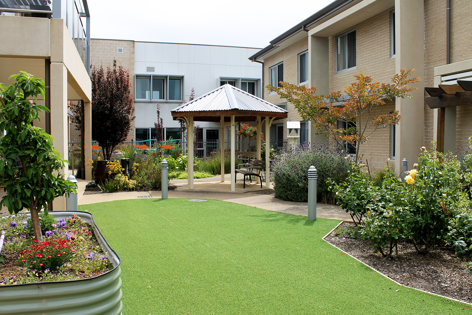 Within each of the wings are several lounge areas featuring classic furnishings, gas log fireplaces and flat screen televisions with Foxtel. Two large dining areas, equipped for fine dining, present refined seating arrangements, and there is opportunity for our residents to enjoy a quieter meal with family and friends in our private function rooms. Barbecue areas in the courtyard offer modern outdoor seating, a pergola and laserlite shading, providing a welcoming environment. Smaller secure courtyards, found throughout the home, allow our residents to safely enjoy the tranquil atmosphere of the landscaped gardens, complete with flower beds and veggie patch.